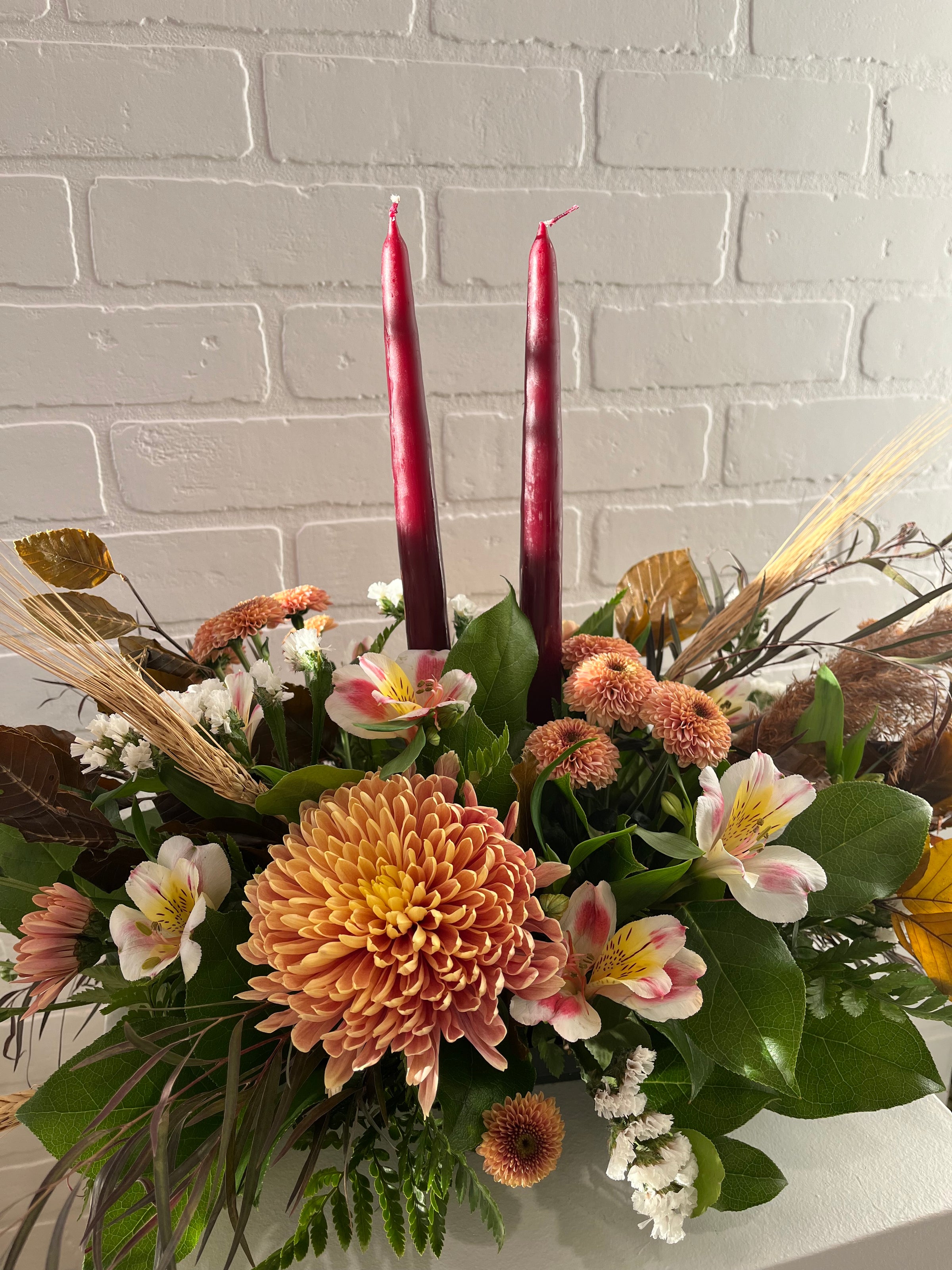 A cozy blend of rich amber tones, crisp foliage, and warm spice accents — this centerpiece brings all the fall feels to your table with effortless charm and seasonal glow.