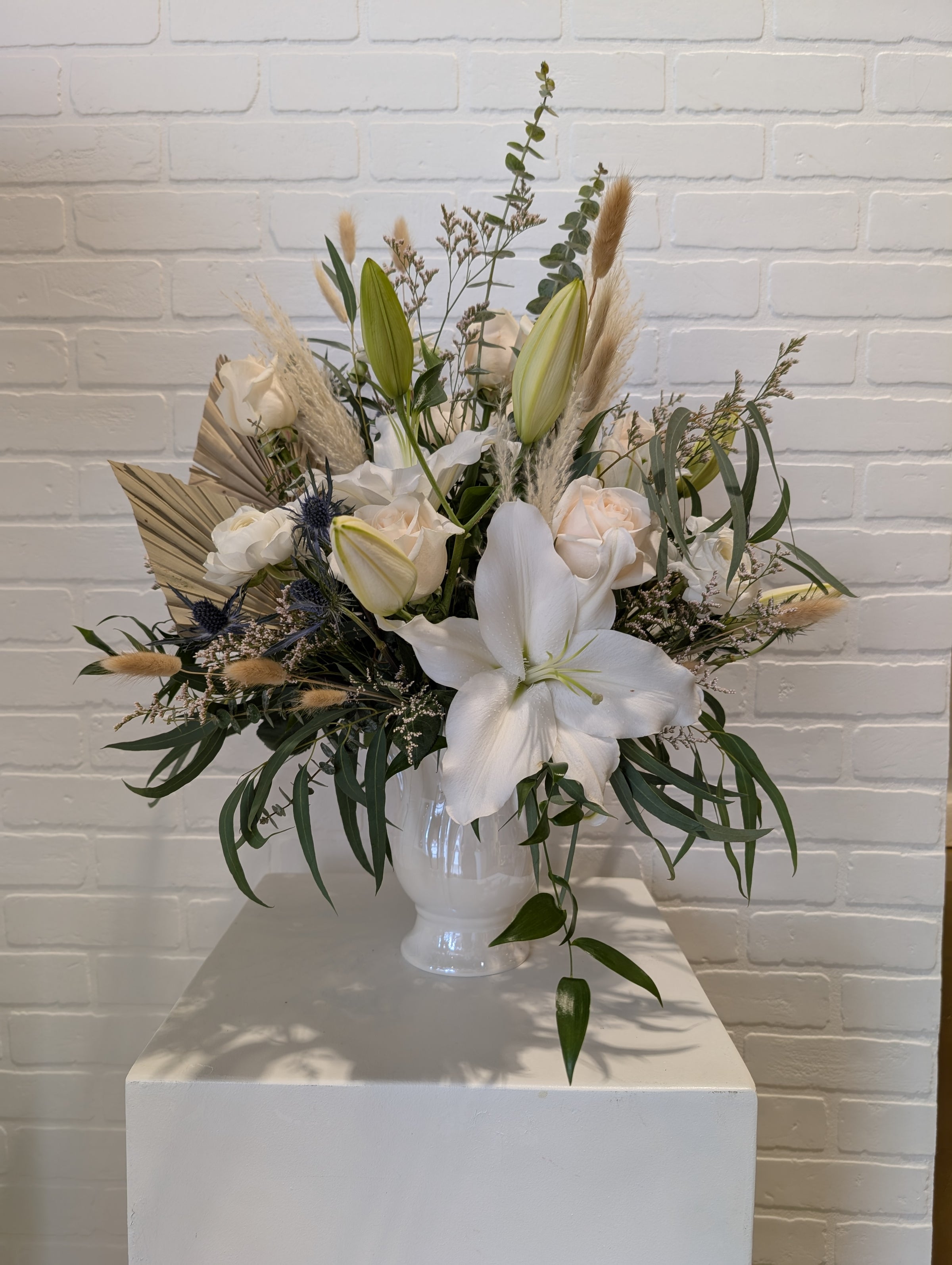 Flowers included: Roses, Lilies, Ranunculus, Eryngium, Bunnytails, Preserved Fans, Feather Eucalyptus, Baby Eucalyptus, & Italian Ruscus.