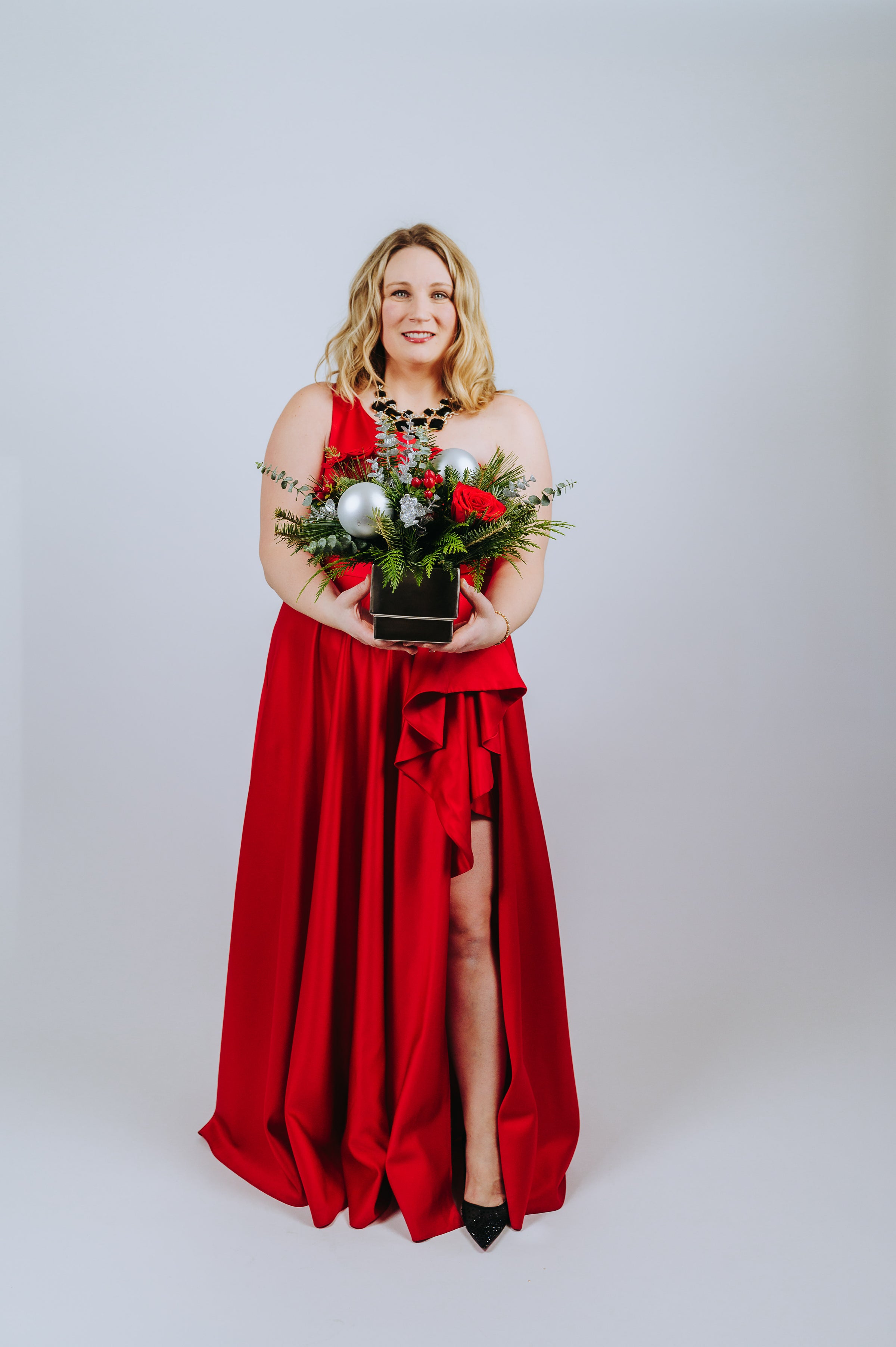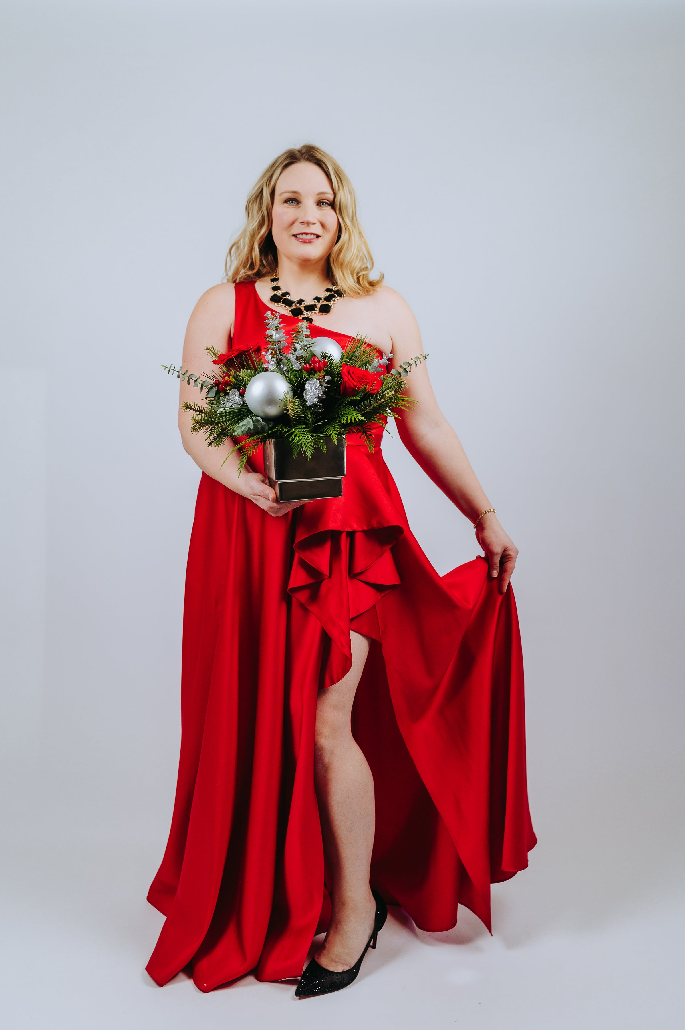 Silver Kisses — A striking winter arrangement of deep red blooms, frosted evergreens, and sleek silver accents, blending bold romance with icy elegance.