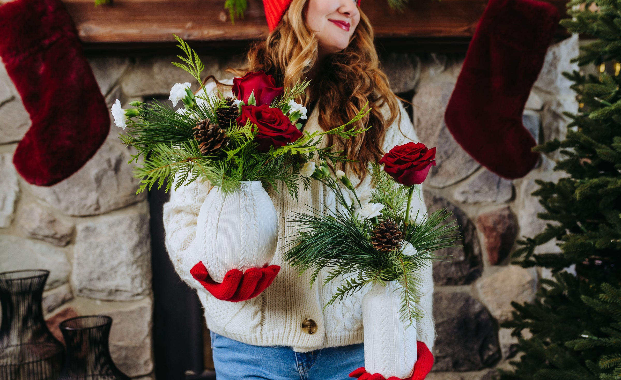 The "Snow Blossom Arrangement" is a stunning display of red roses, delicate white flowers, and vibrant green foliage, elegantly arranged in a textured white vase, evoking the serene beauty of a winter landscape.