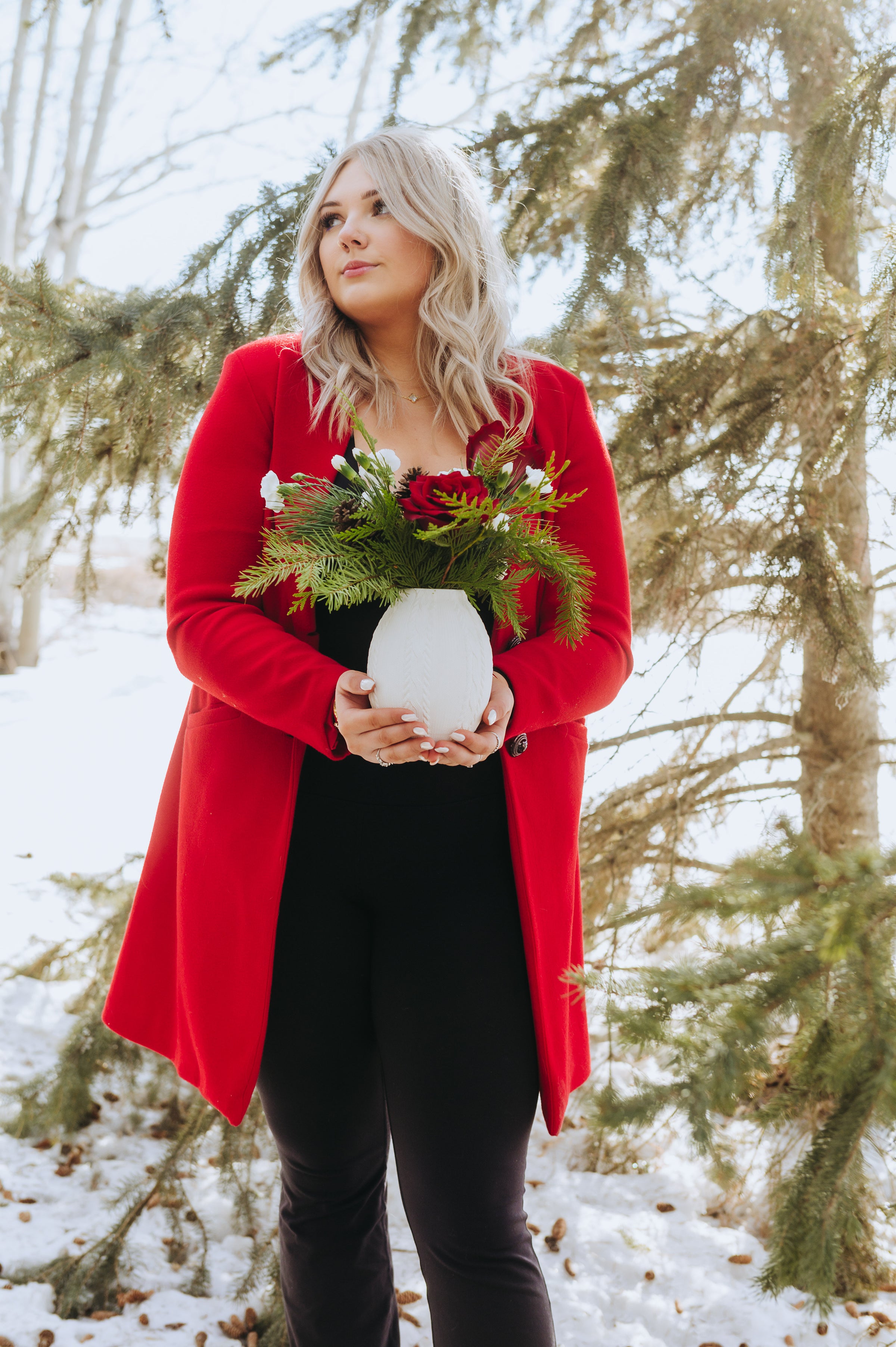 Flowers included: Red Rose, White Mini Carnations, Cedar, Douglas Fir, & Pine.