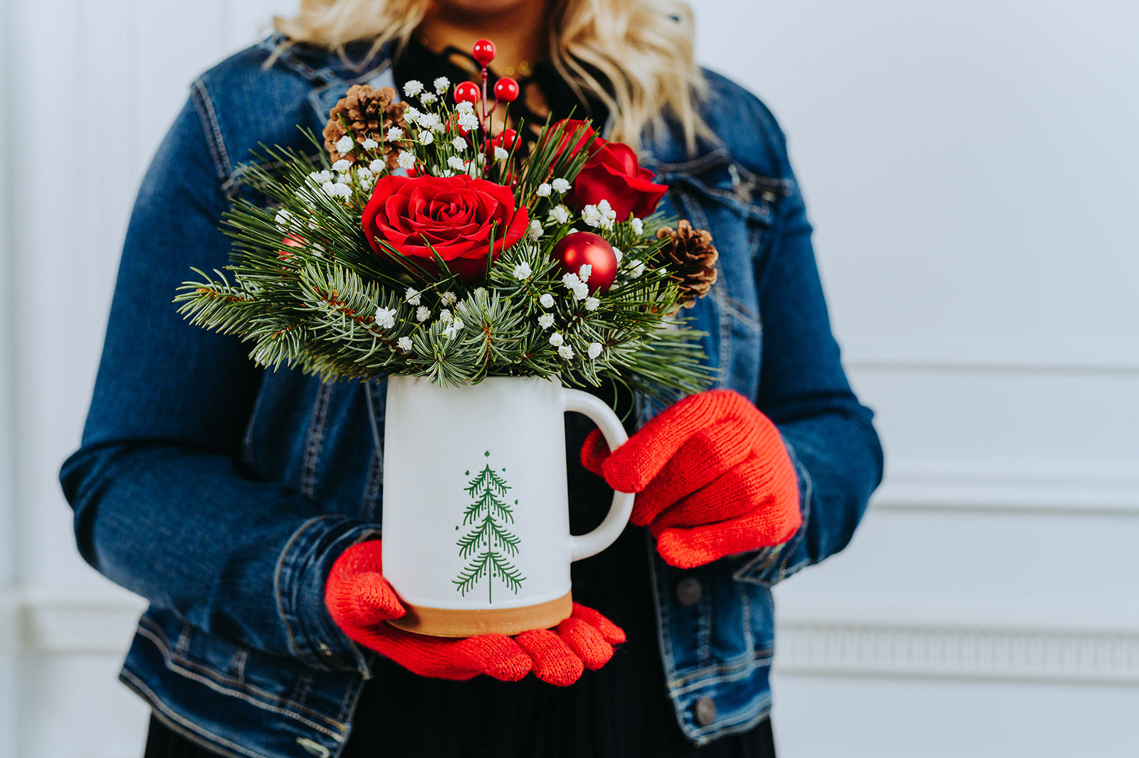 Starlit Snowfall Arrangement — A cozy winter design featuring radiant red roses, frosted greenery, pinecones, and sparkling berry accents, all gathered in a festive mug for a touch of seasonal charm.
