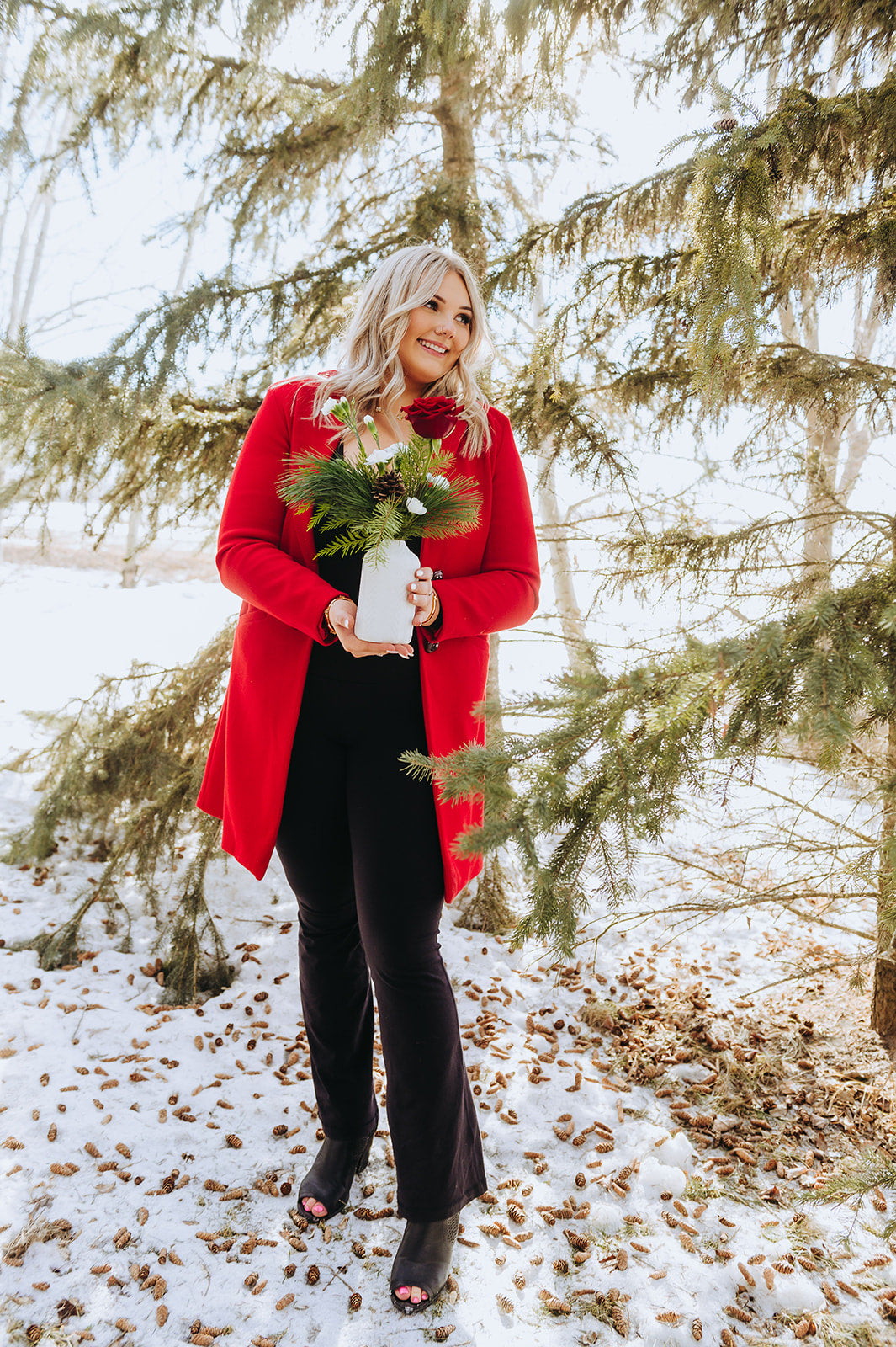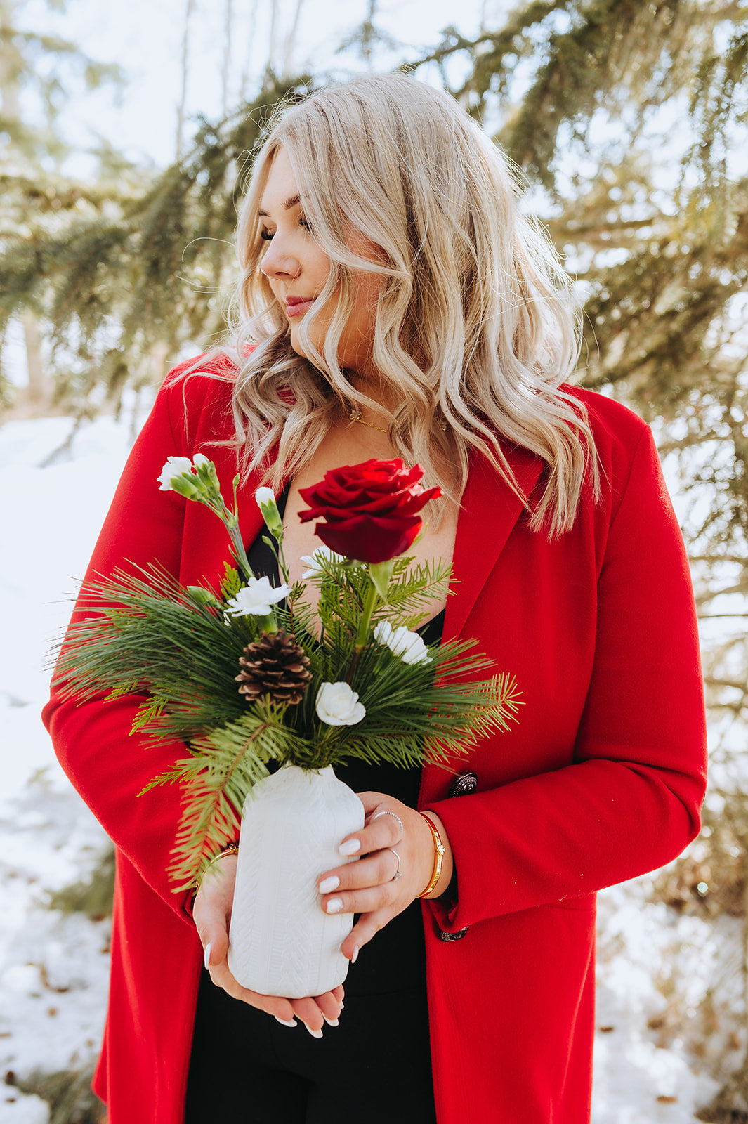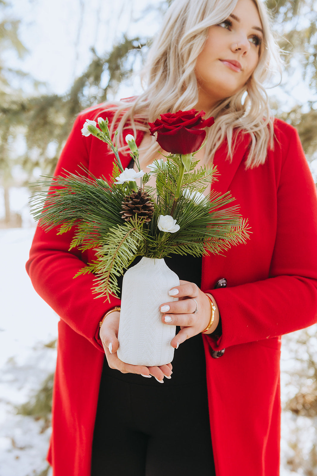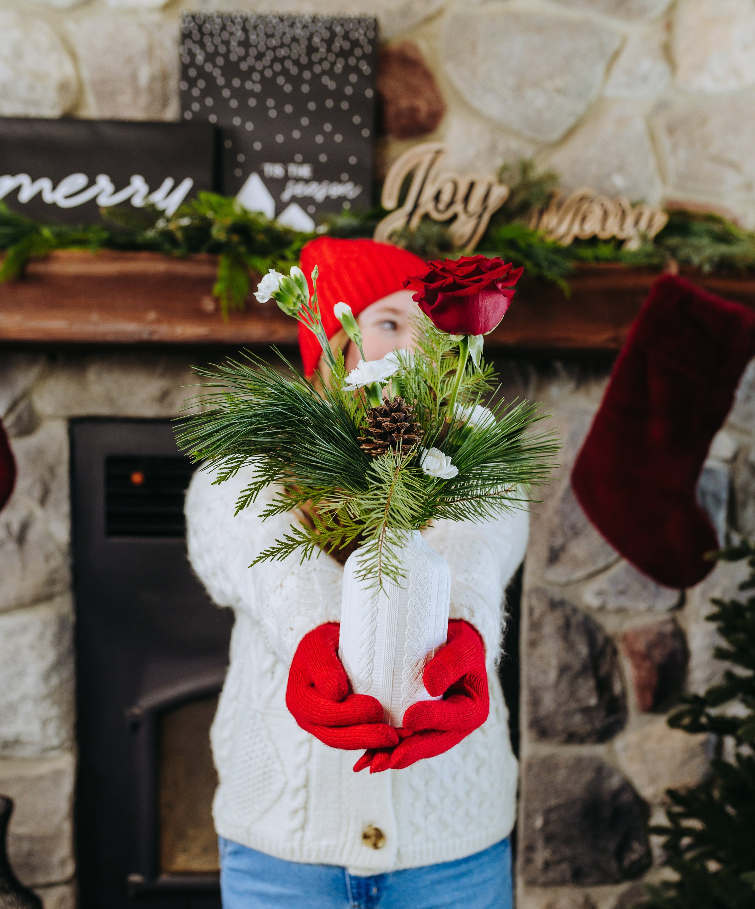 Flowers included: Red Rose, White Mini Carnations, Douglas Fir, Pine, & Cedar.