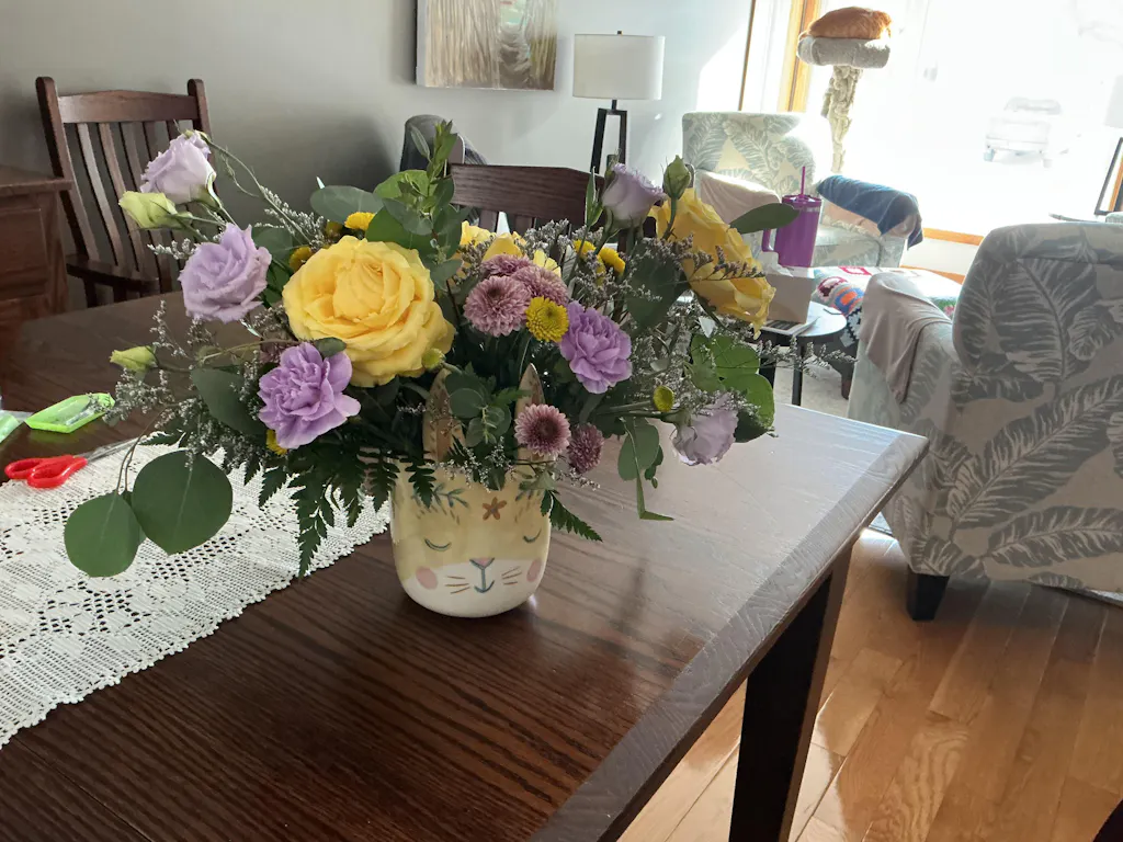 I received my beautiful arrangement for Easter. Arrived on time, flowers are beautiful and fresh. It was easy using the online ordering process. It is not the first time I have received flowers from this company. Always happy with my purchase.