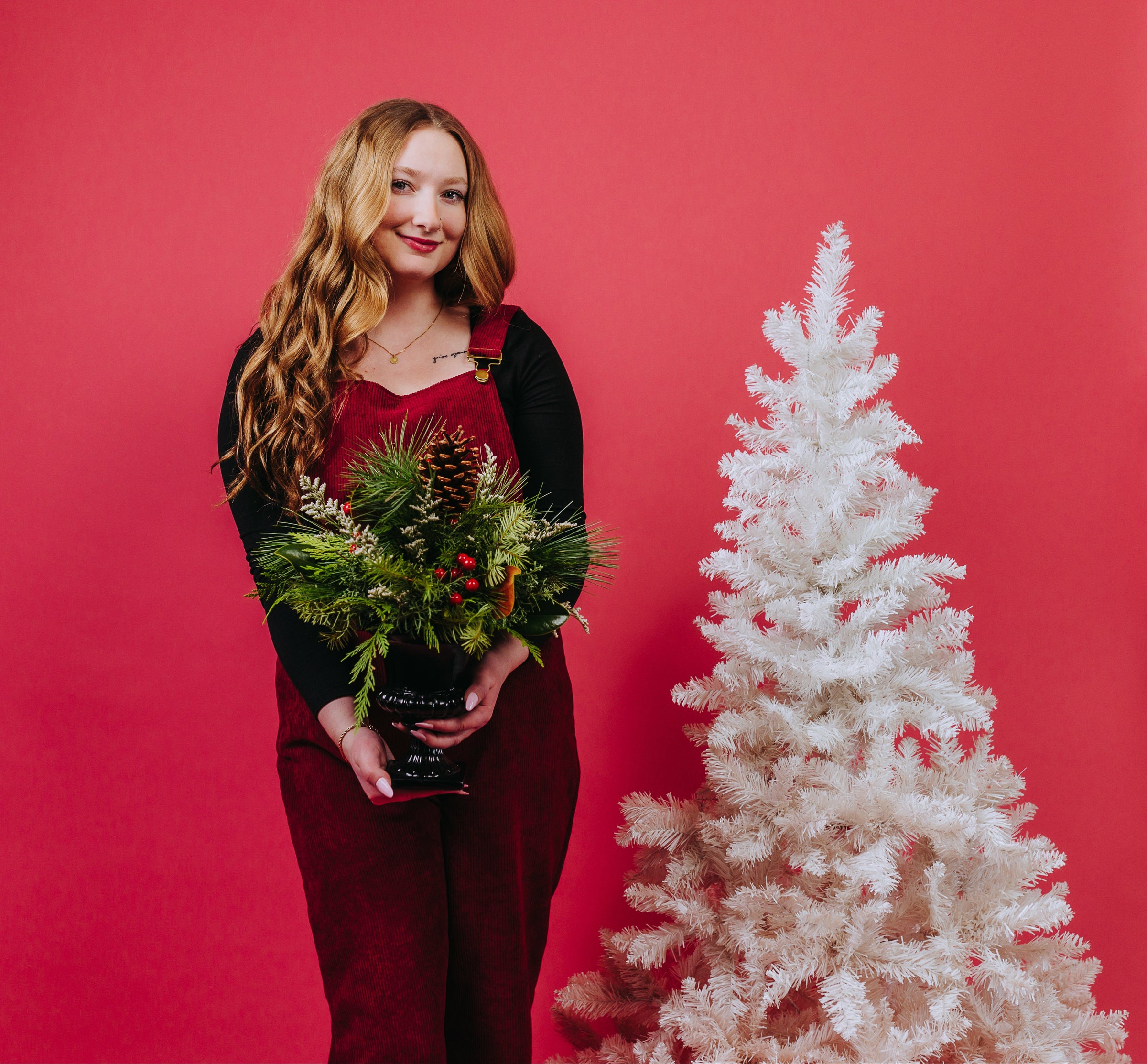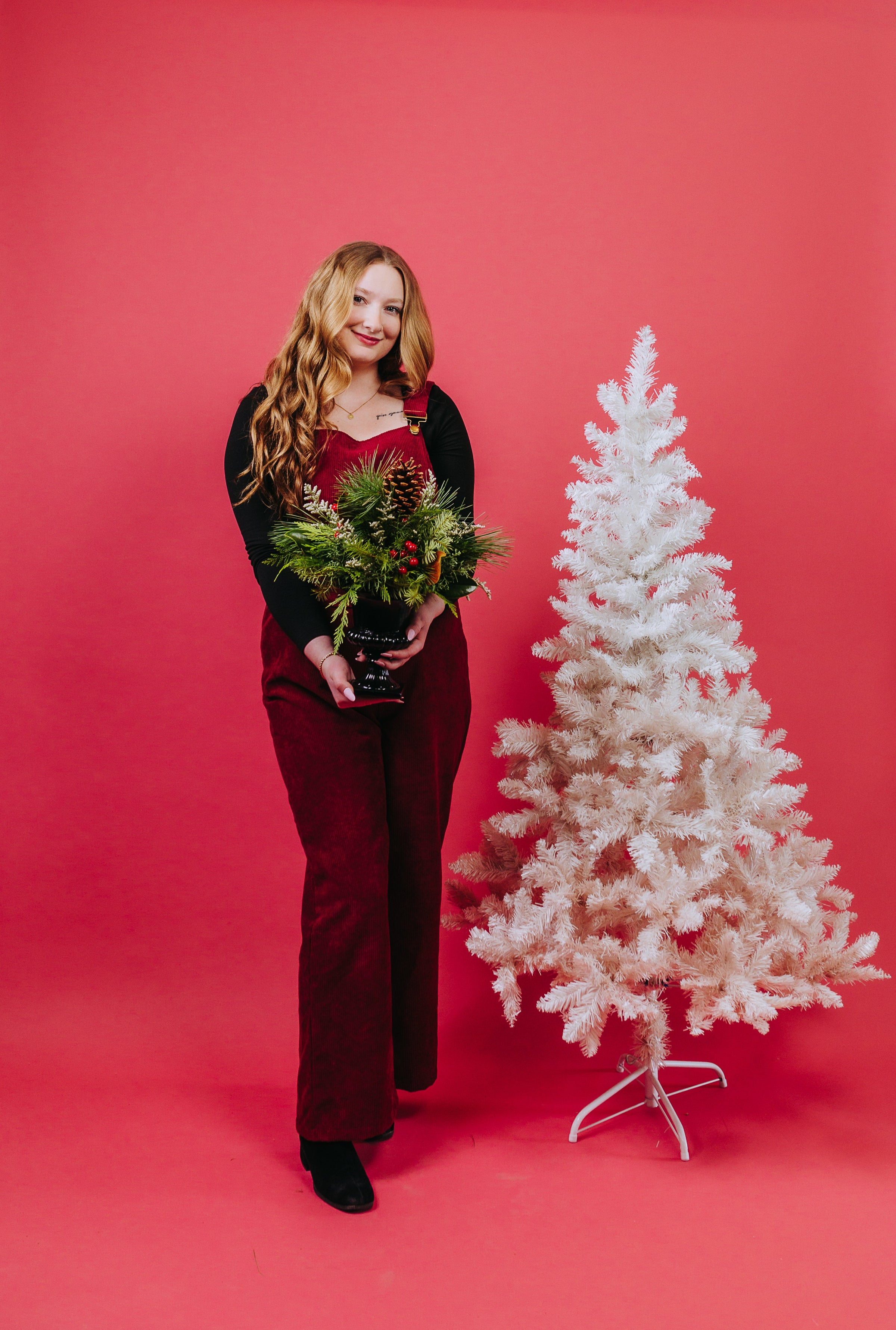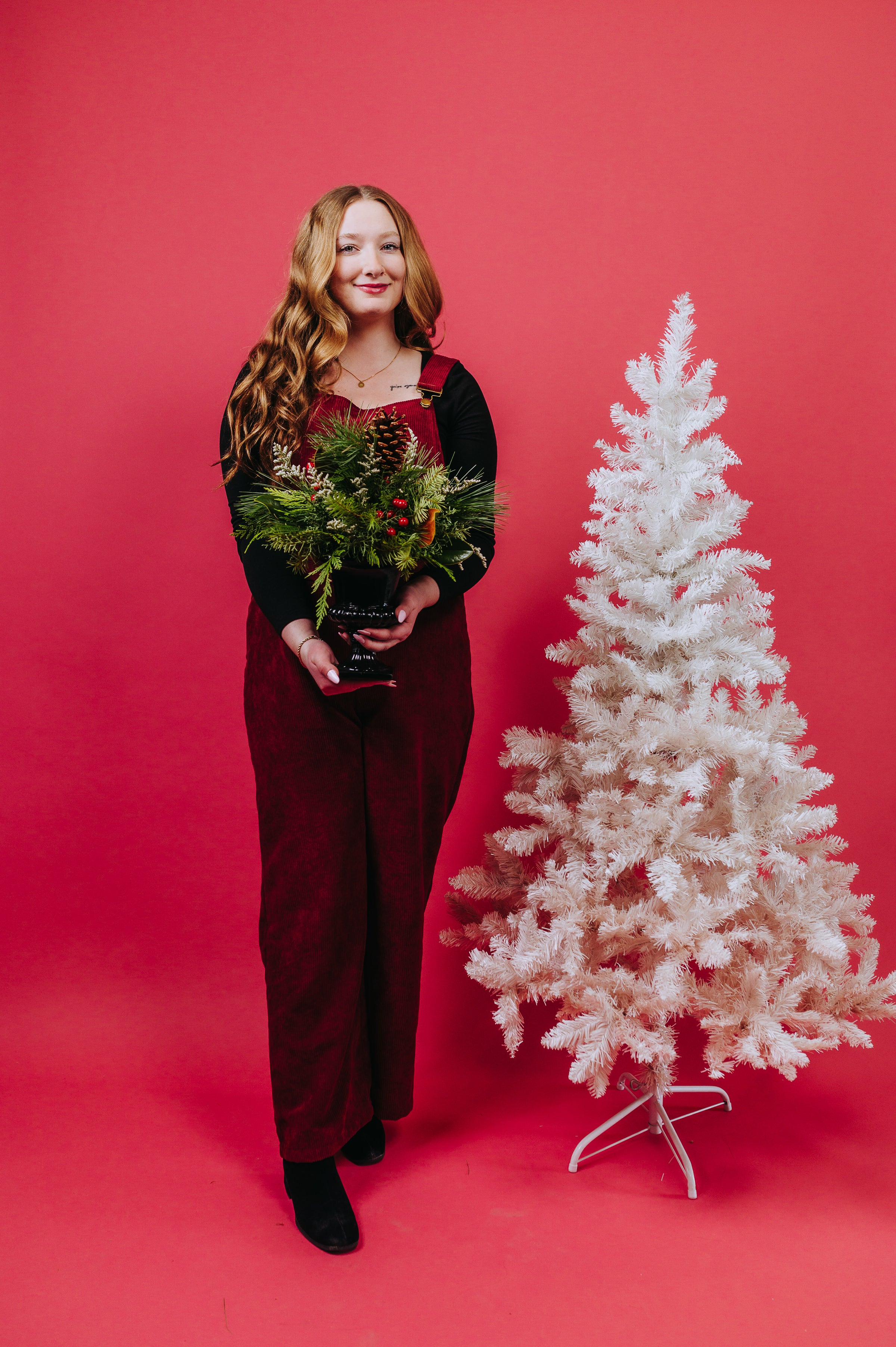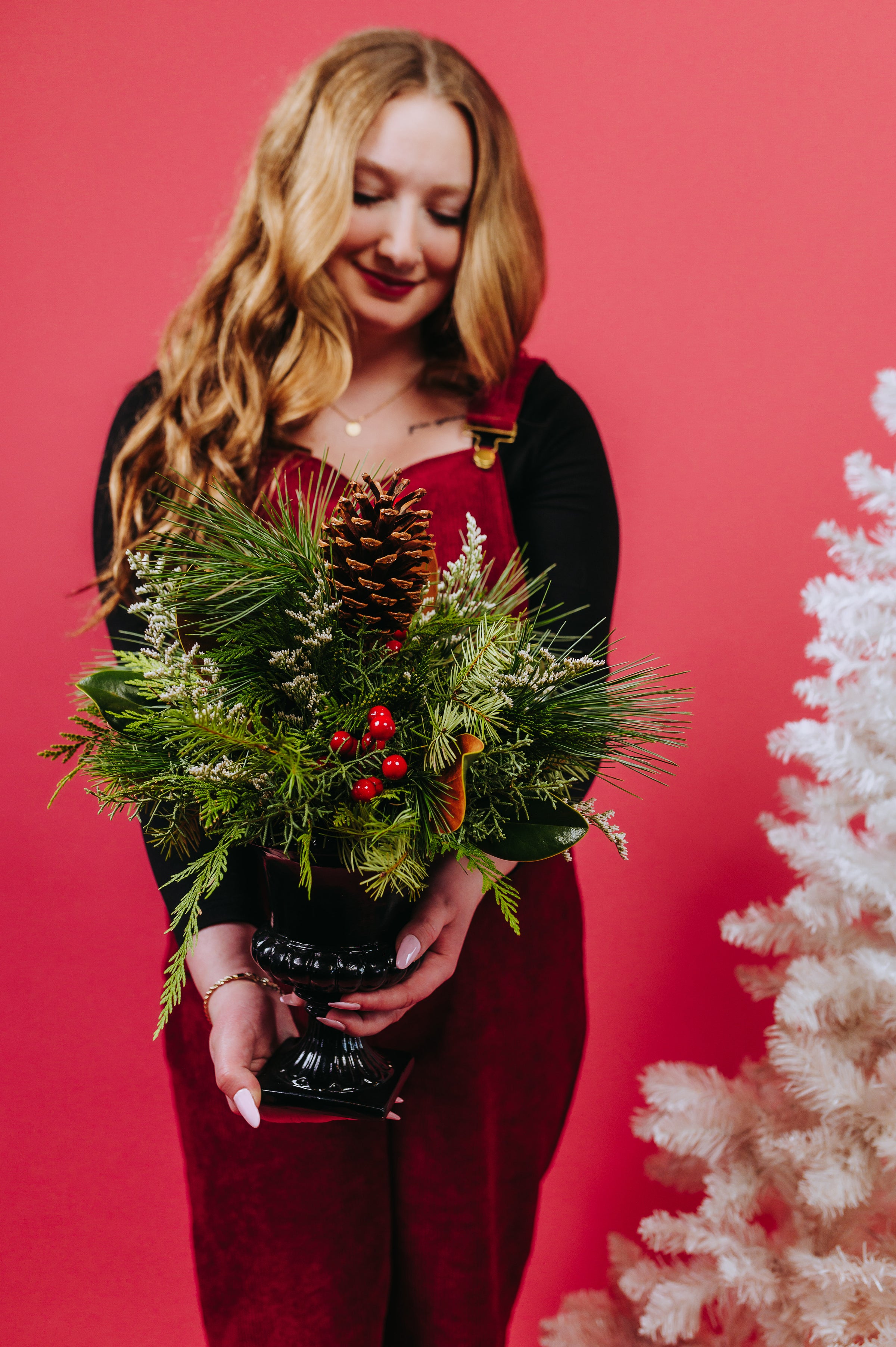 Frost & Berry Arrangement — A charming winter mix of fresh evergreens, frosted accents, bright red berries, and a rustic pinecone, capturing the crisp beauty of the season.