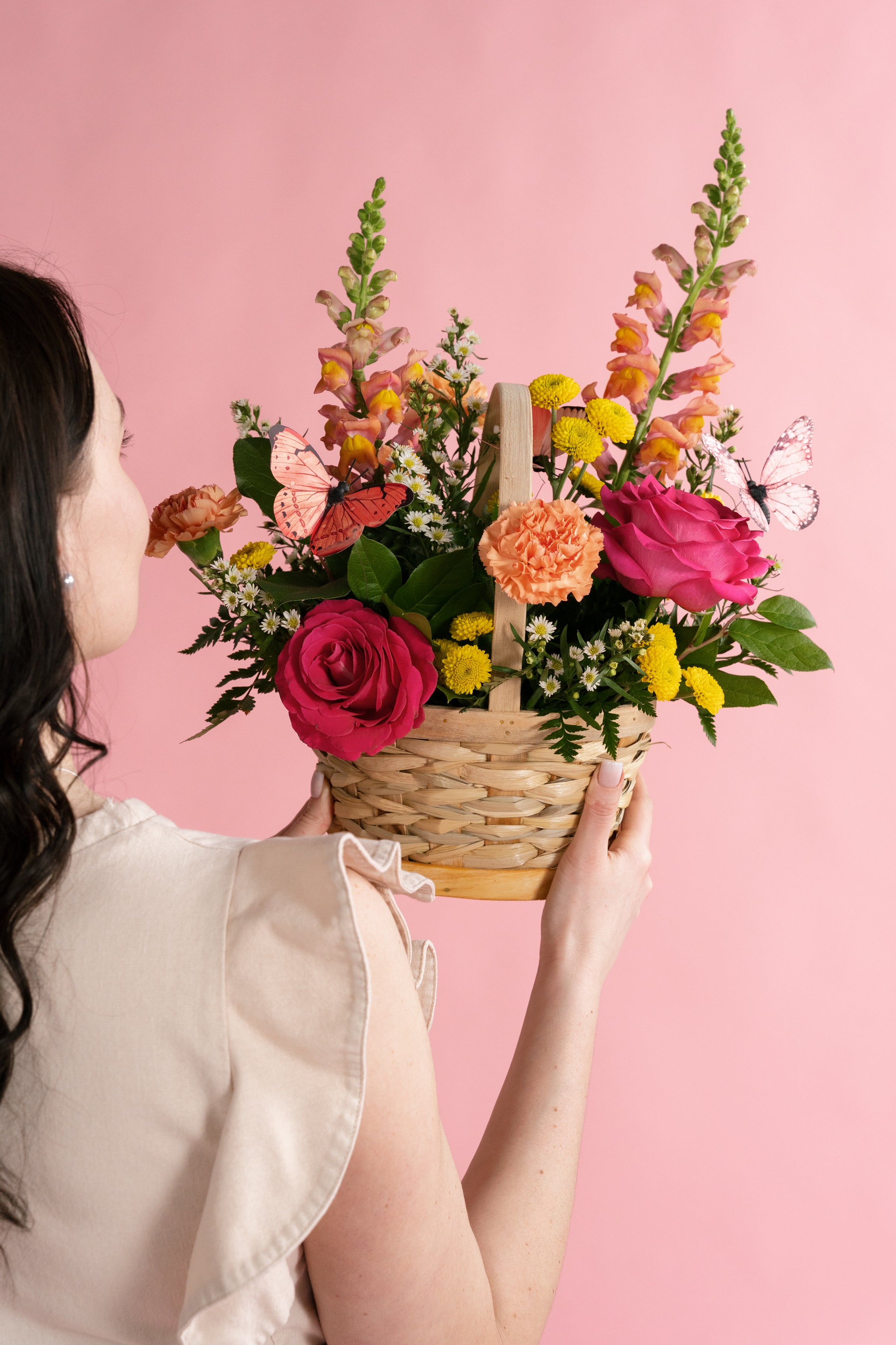 The Palm Springs Arrangement is bold, bright, and full of personality, featuring vibrant pinks, warm peach tones, and pops of sunny yellow layered with fresh greenery. Designed in a playful basket style with fun accents, it has a lively, retro-inspired feel. A cheerful statement piece that brings colour, energy, and a touch of whimsy to any space.